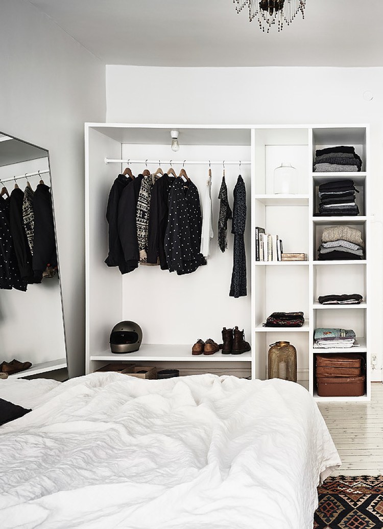 While this type of wardrobe will take the least space it does require some amount of restraint. You’ll need to be tidy and organised as your clothes will be in full view and you’ll need to stick to a reasonably small, curated set of clothes as storage is limited with an open wardrobe. In other words, this isn’t for everyone but it’s a good idea if you are naturally more minimalistic with your clothes.