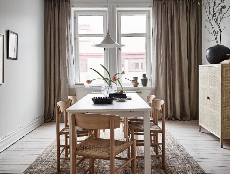 Rugs add instant warmth in any space and though they’re very commonly seen in living areas, they’re not as common in dining rooms. Simply adding a rug to your dining area is one easy way to cosy up your dining space instantly. Consider natural materials like wool or jute that add texture and warmth.